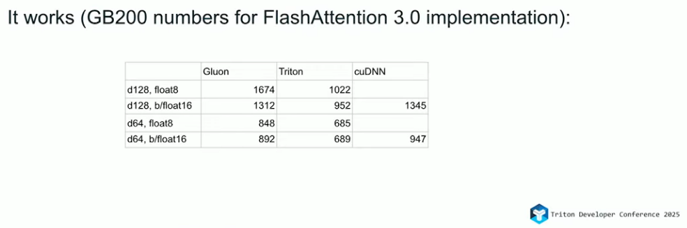 总结:在 Gluon 中,诸如 Tile 布局、内存分配、数据搬移以及异步处理等原本由 Triton 编译器自动管理的机制被显式暴露给开发者。通过让程序员直接控制这些关键性能路径,Gluon 在保持良好可用性的同时,能够进一步逼近硬件极限:如果说 Triton 通常能达到约 80% 的硬件性能,那么 Gluon 则有潜力将性能提升到 90% 甚至更高,如图【4】所示,Gluon实现的在FlashAttention性能逼近CUDA实现的cuDNN算子库性能。