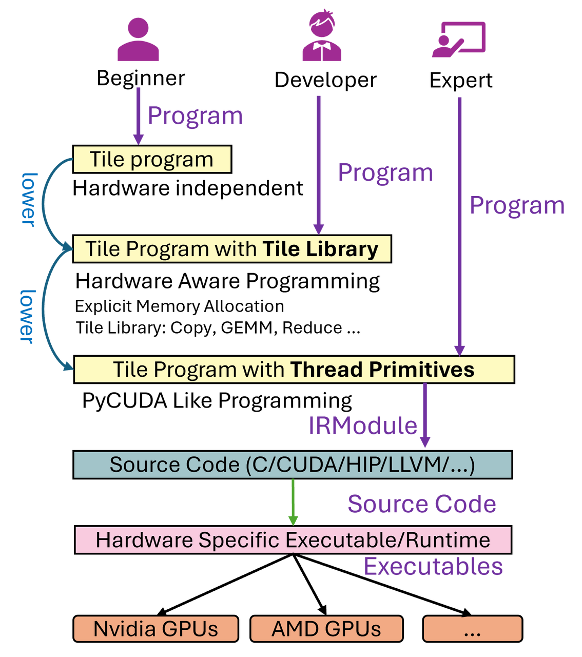 根据 TileLang 官方文档介绍,TileLang 为异构加速器(如 GPU)提供了分层次的编程接口,以适配不同水平与需求的开发者。其总体目标是:在保持高效性能的同时,为用户提供尽可能友好的编程体验。TileLang 目前定义了三种编程层级: