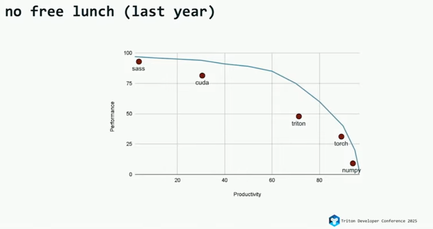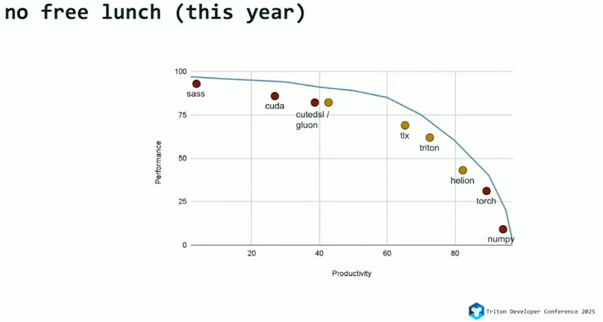 在 2025 年 Triton Conference 上,OpenAI 的 Triton 语言创始人 Philippe Tillet 回顾并梳理了 2024—2025 年间多种算子开发语言如何在性能(performance) 与开发效率(productivity) 之间进行权衡与取舍。如图【1】、图【2】: