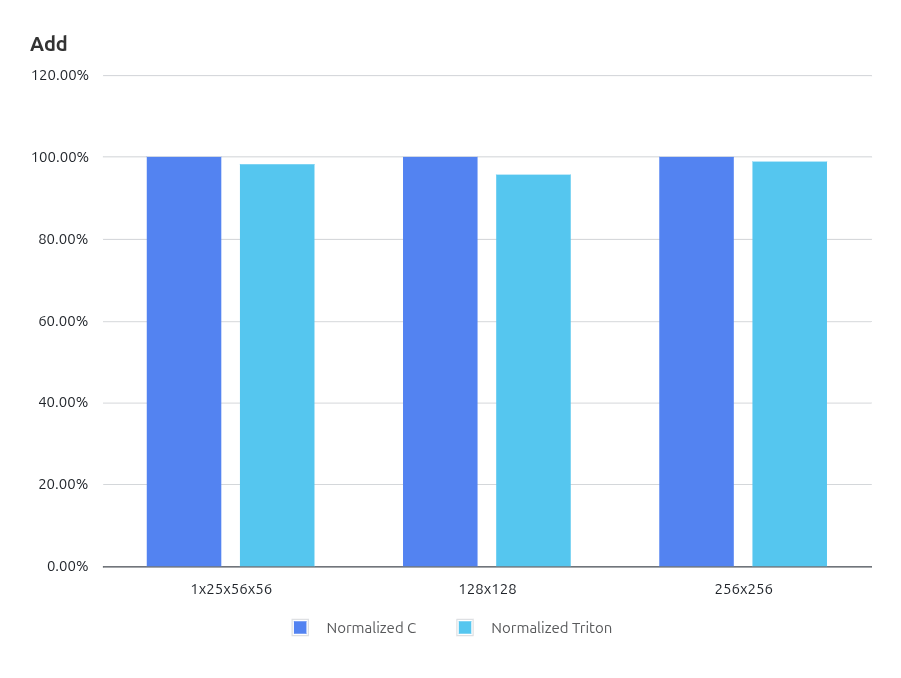 为了直观比较 Triton 编译生成代码与手写 C 实现之间的执行效率,本文对下列实验结果进行了归一化处理,并统一采用 Normalized C 与 Normalized Triton 两个指标进行展示。