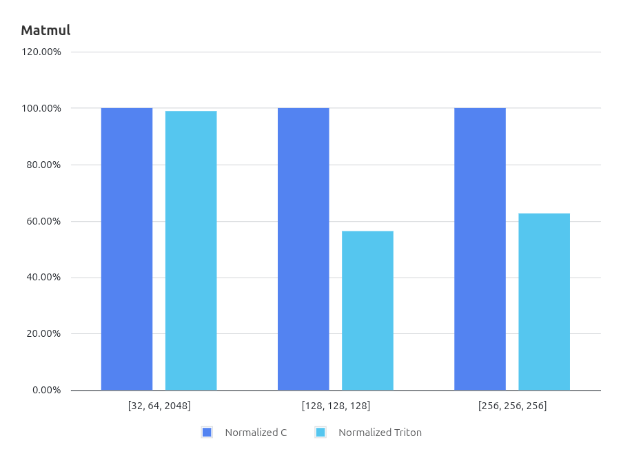Normalized Triton(相对执行效率) 表示 Triton 编译生成代码的执行周期数相对于 C 实现的百分比,用于衡量 Triton 生成代码在目标硬件上的执行效率。