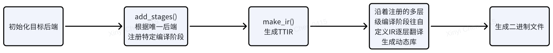 2.注册编译阶段(add_stages())。基于第一阶段确定的后端,通过 add_stages() 方法注册一系列用于适配特定硬件架构的编译阶段,每个阶段对应一个中间表示的转换过程。