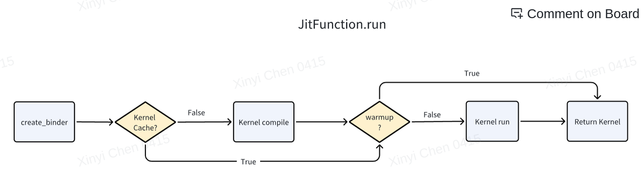 首先,JITFunction 会查找缓存 kernel;如果没有缓存,它会触发 ASTSource 的生成与后端编译,生成可执行 kernel。在 warmup=False 的情况下,编译好的 kernel 会立即被 launch 执行,实现真正的计算。这种设计既允许延迟执行和参数缓存,也支持在第一次调用时进行即时编译和运行,从而兼顾灵活性与性能。