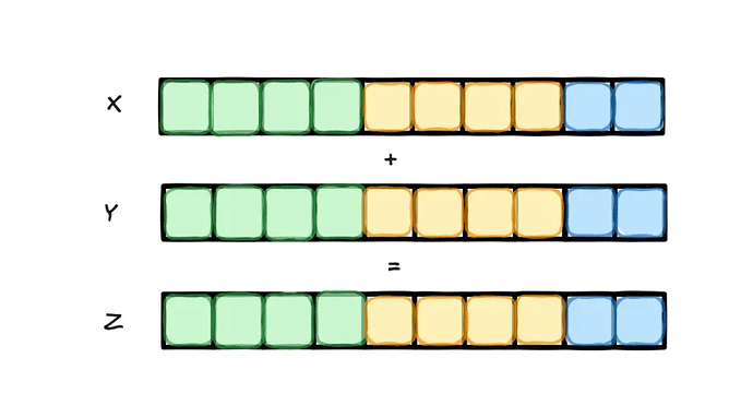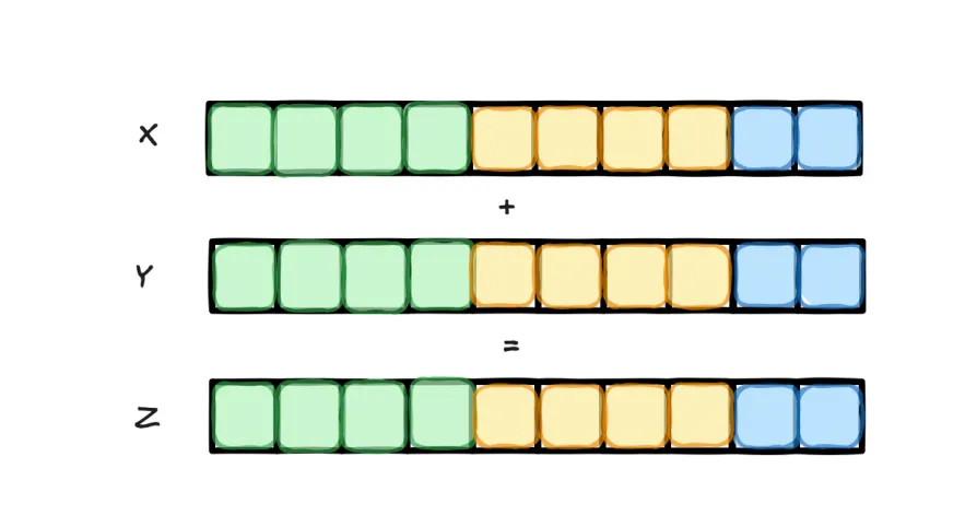 向量加法实现输入向量X与Y的逐元素求和,采用分块并行策略:单个内核实例处理固定大小数据块,多实例并行处理不同块以实现全局加速。(如下图所示,一个内核实例会处理绿色块,另一个处理橙色块,第三个则处理蓝色块)。