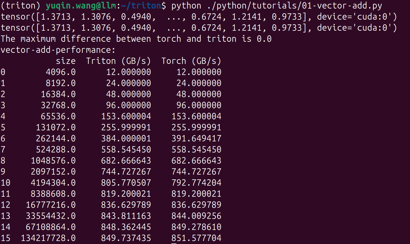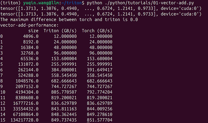 运行结果:triton的计算结果与torch保持一致,性能也接近torch。