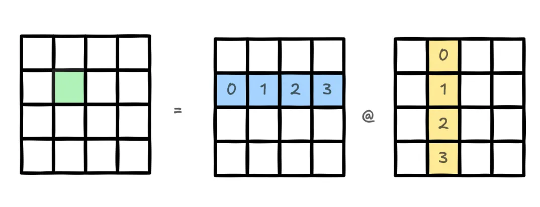 矩阵乘法是深度学习中的计算密集型核心算子,Triton采用分块乘法策略:将大规模矩阵分解为多个小尺寸块(如16×16,下图中绿色的输出块可以表示为多个蓝色块和黄色块矩阵乘法的和),通过块级计算减少全局内存访问,利用GPU缓存提升数据复用率,多实例并行处理不同输出块实现加速。