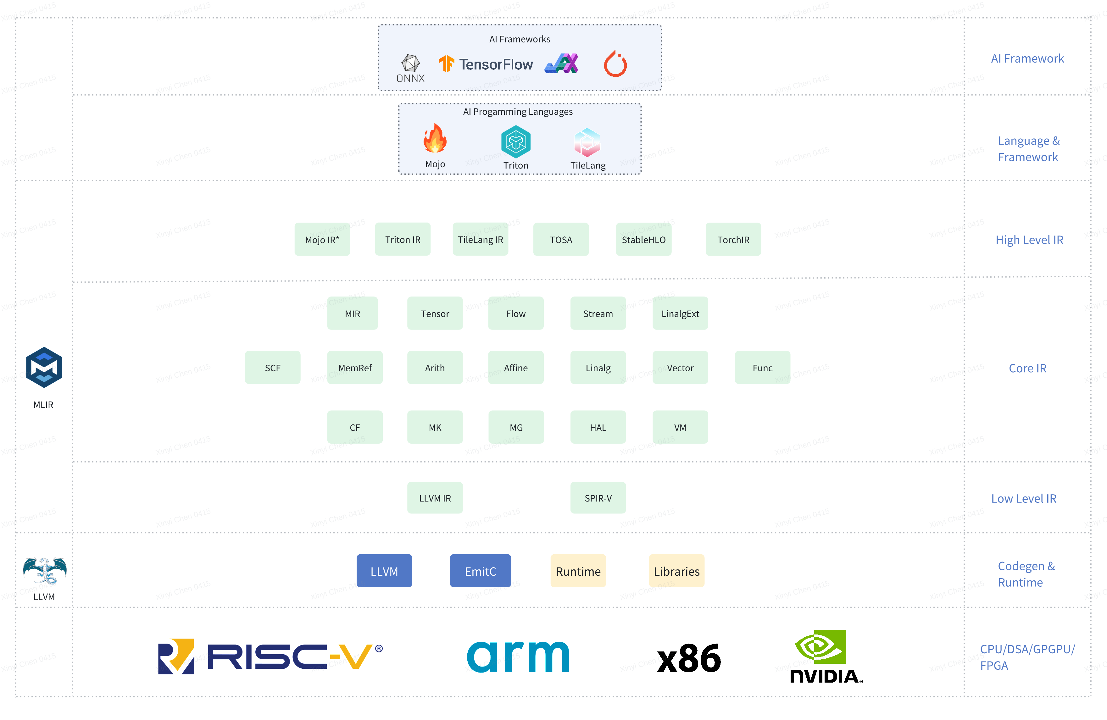 传统编译器(如 LLVM)通常采用单一 IR 来统一承载从高层语言语义到底层机器码的全部信息。这种设计在通用编程语言领域行之有效,但在 AI 编译场景下逐渐显露出局限性: